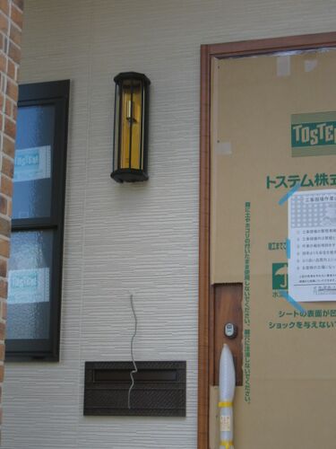 今日は、現場は閑散としています。 職人さんは1人だけ・・・です。 左官屋さんが玄関の階段のタイルの手直し(一部張替え)されていました。 照明器具が一部分取り付けてありました。 玄関の外灯です、いちようセンサー付きです。 夜間、犬とか猫でも前を通…
